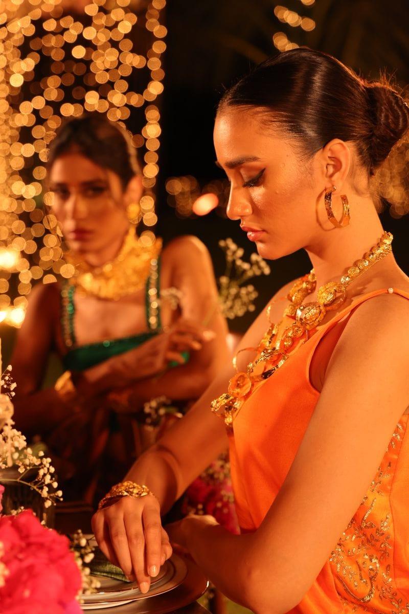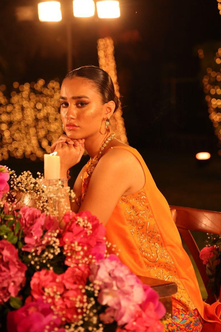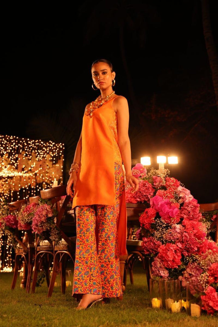 Straight silk orange shirt with zardozi and sequence work paired with block printed bootcut pants.