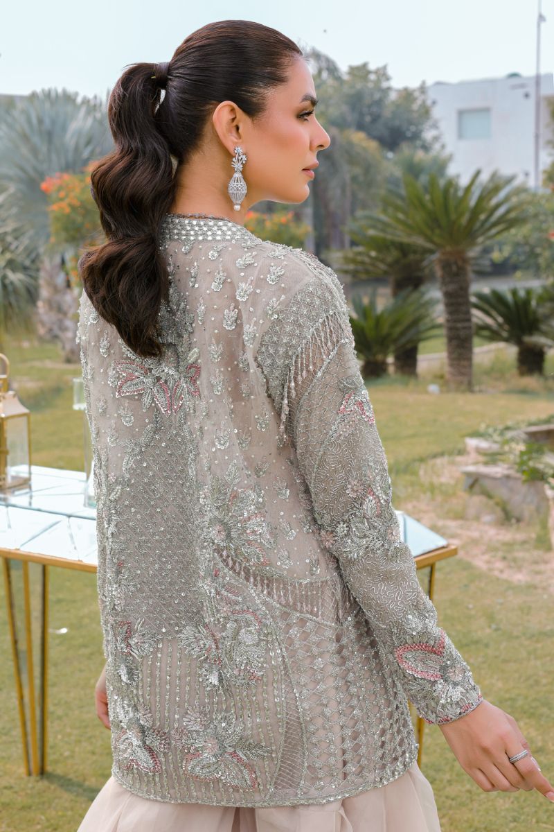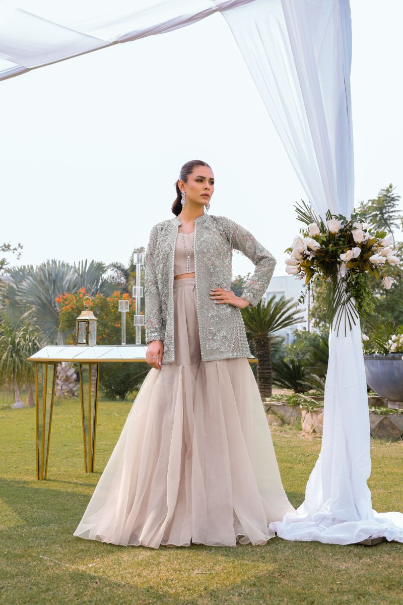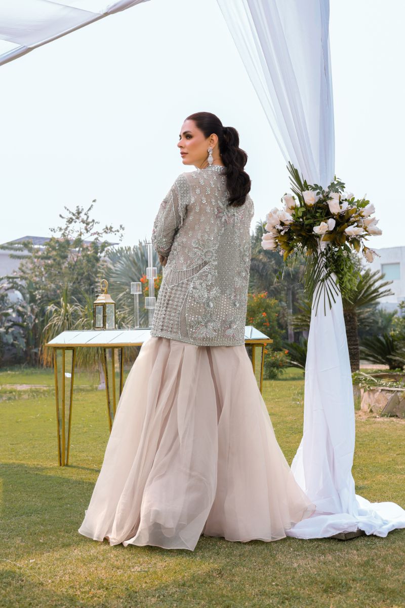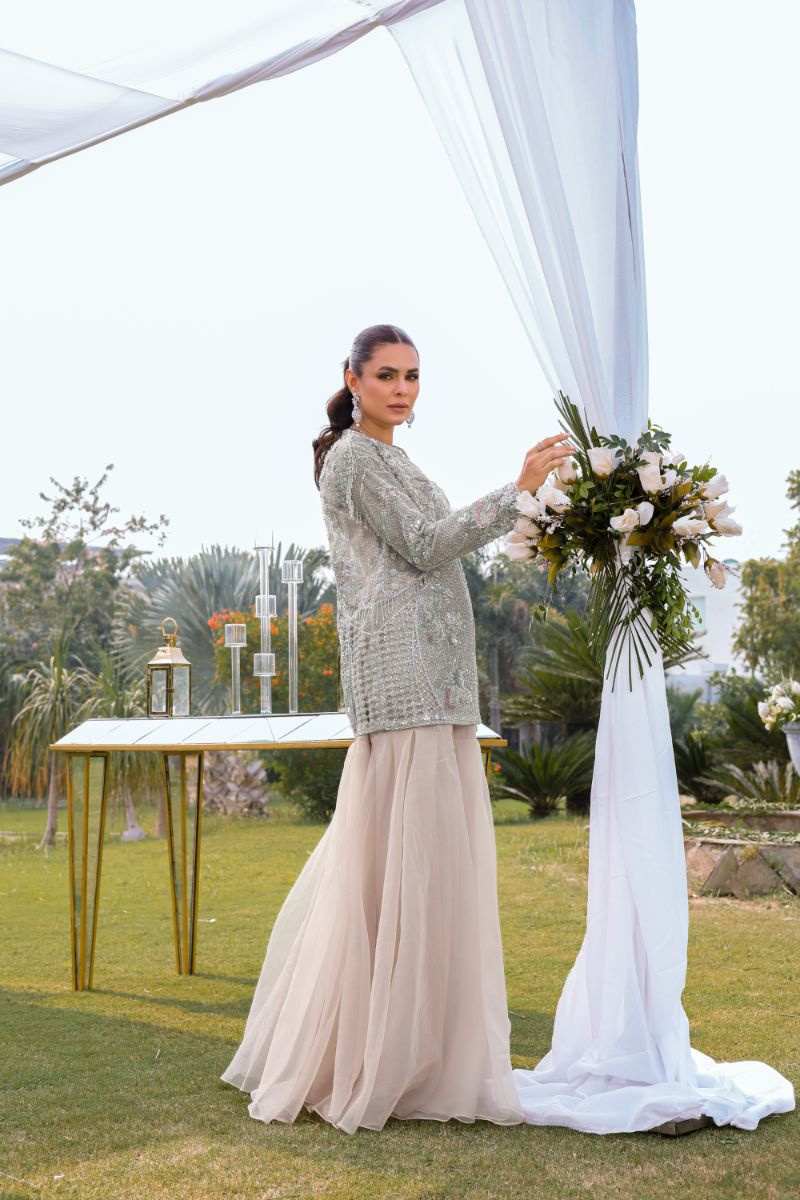 This piece confidently redefines contemporary elegance with an undeniable touch of opulence, expertly crafted using cutting-edge embellishment techniques. The statement silhouette is boldly enhanced with a flared sharara, guaranteeing that it will stand the test of time as a true work of art for years to come.
