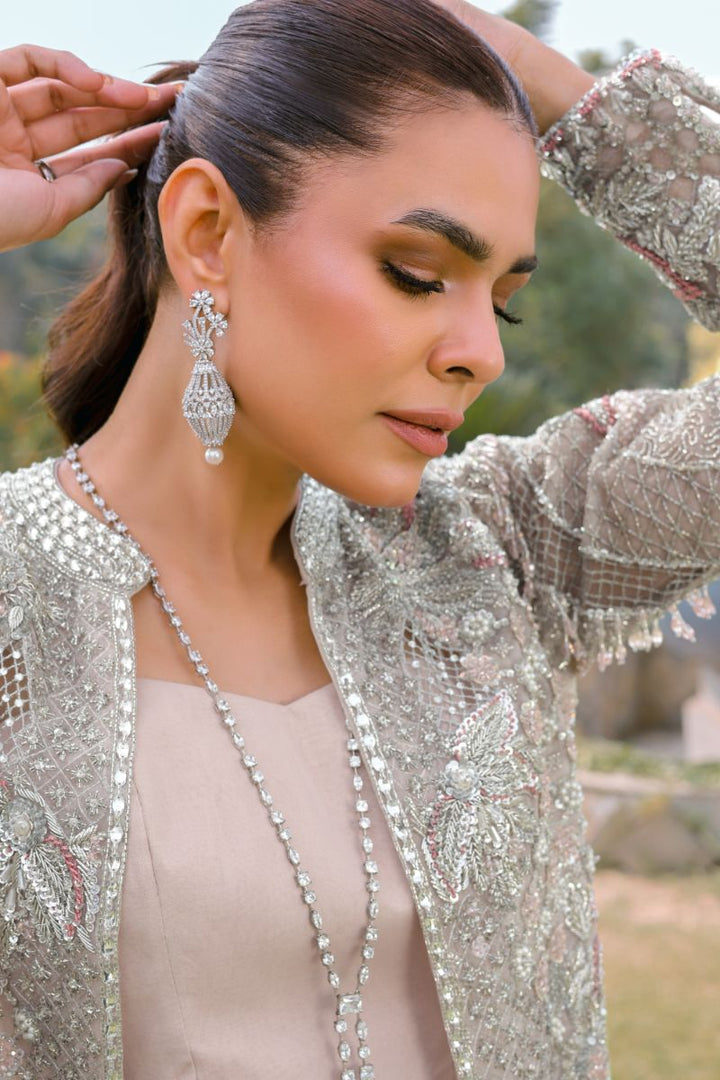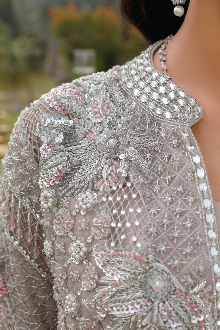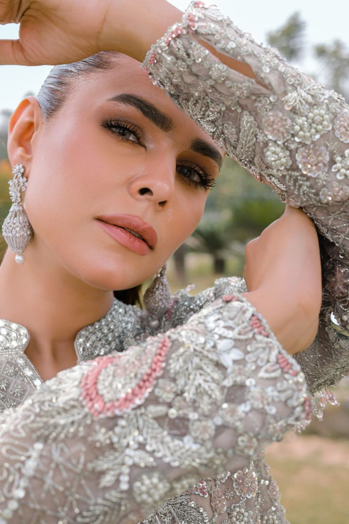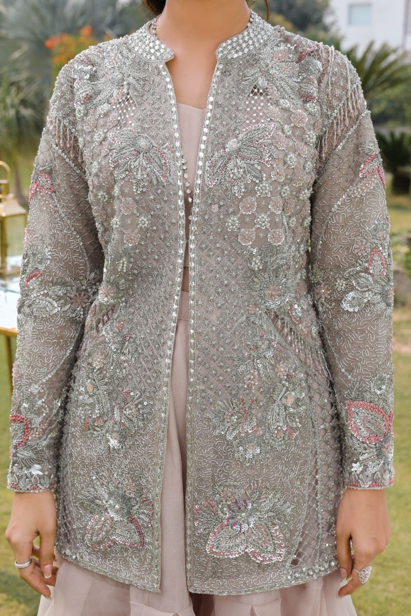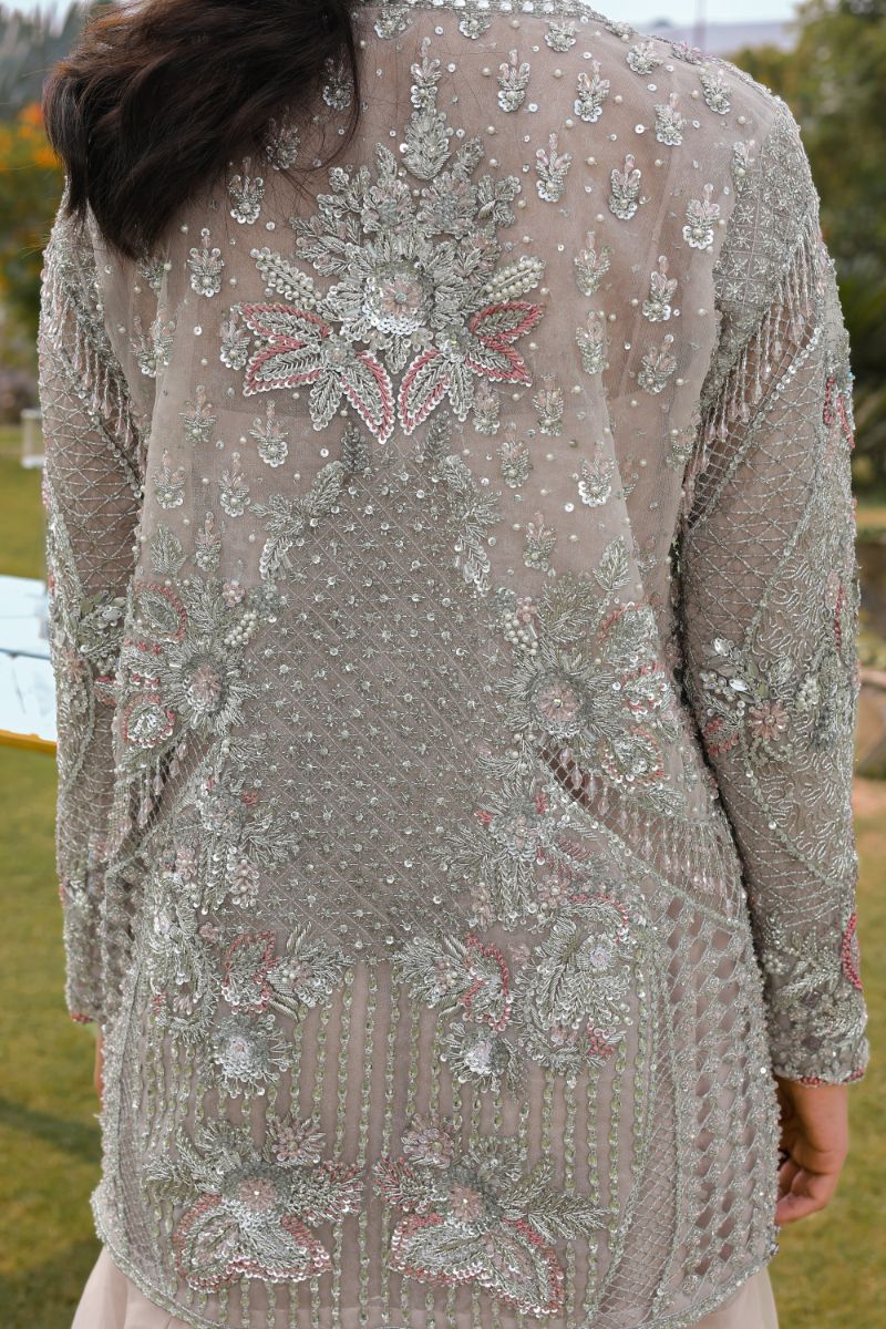 This piece confidently redefines contemporary elegance with an undeniable touch of opulence, expertly crafted using cutting-edge embellishment techniques. The statement silhouette is boldly enhanced with a flared sharara, guaranteeing that it will stand the test of time as a true work of art for years to come.