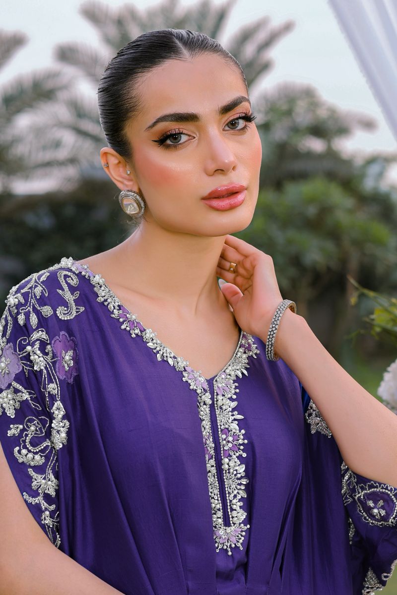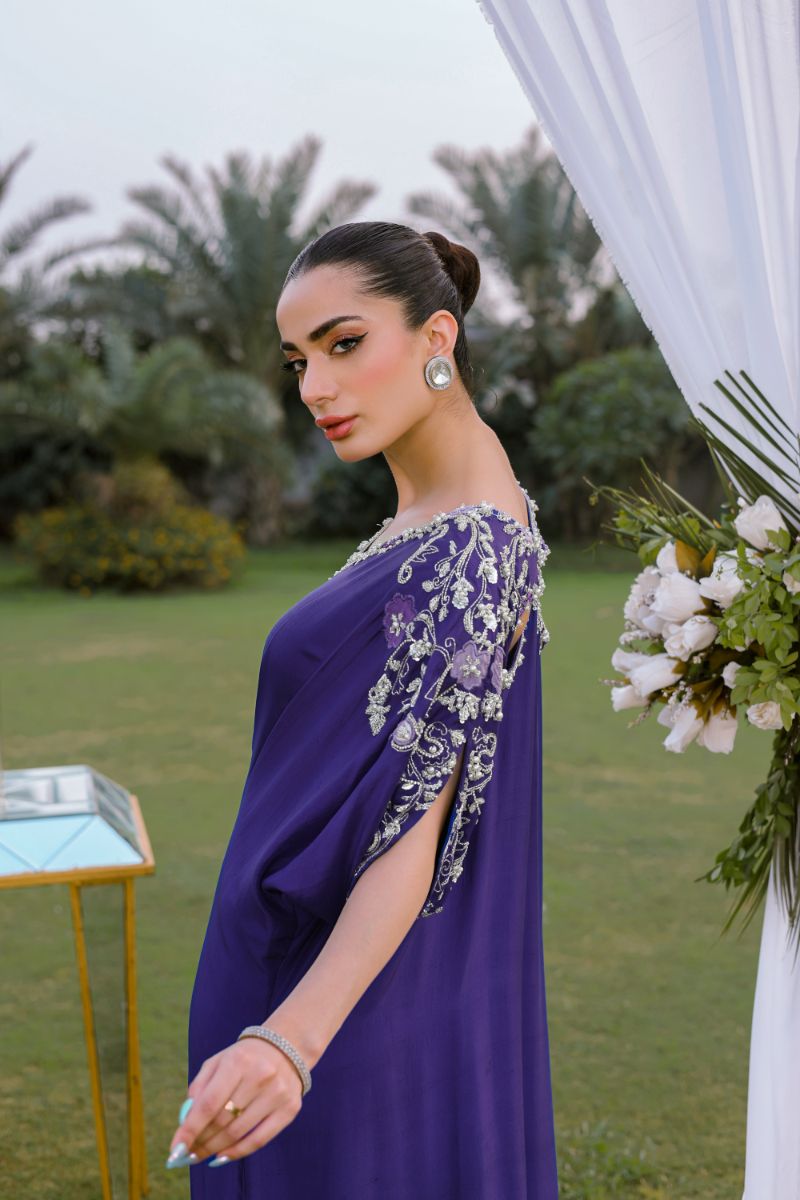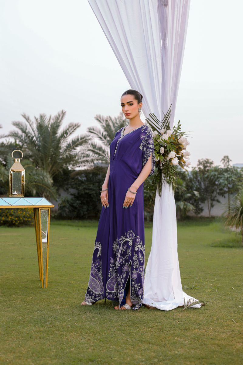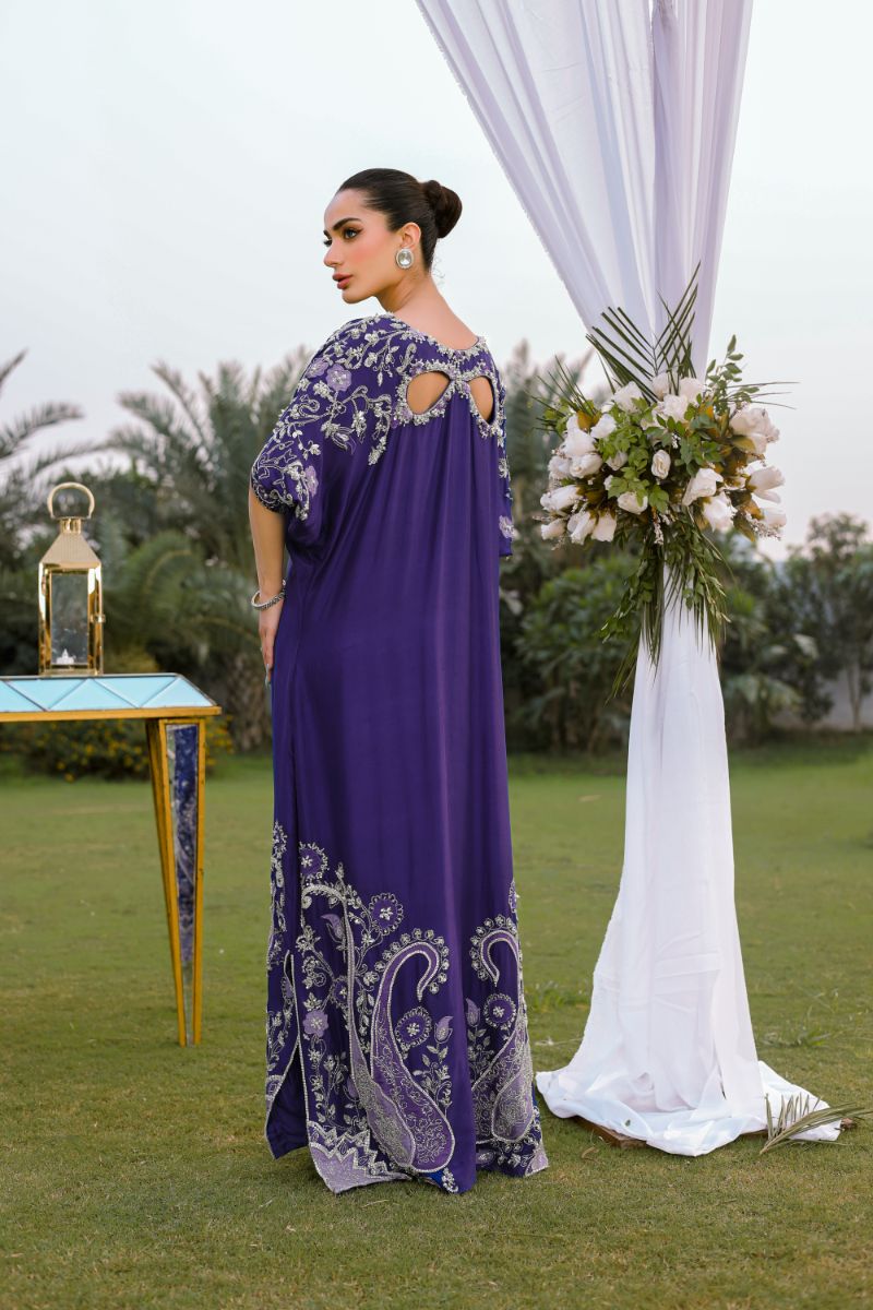 This kaftan is a delightful assemblage of intricately crafted applique work in a floral pattern brought to like through exquisite handwork. It is the perfect ensemble of modern style for you this season.