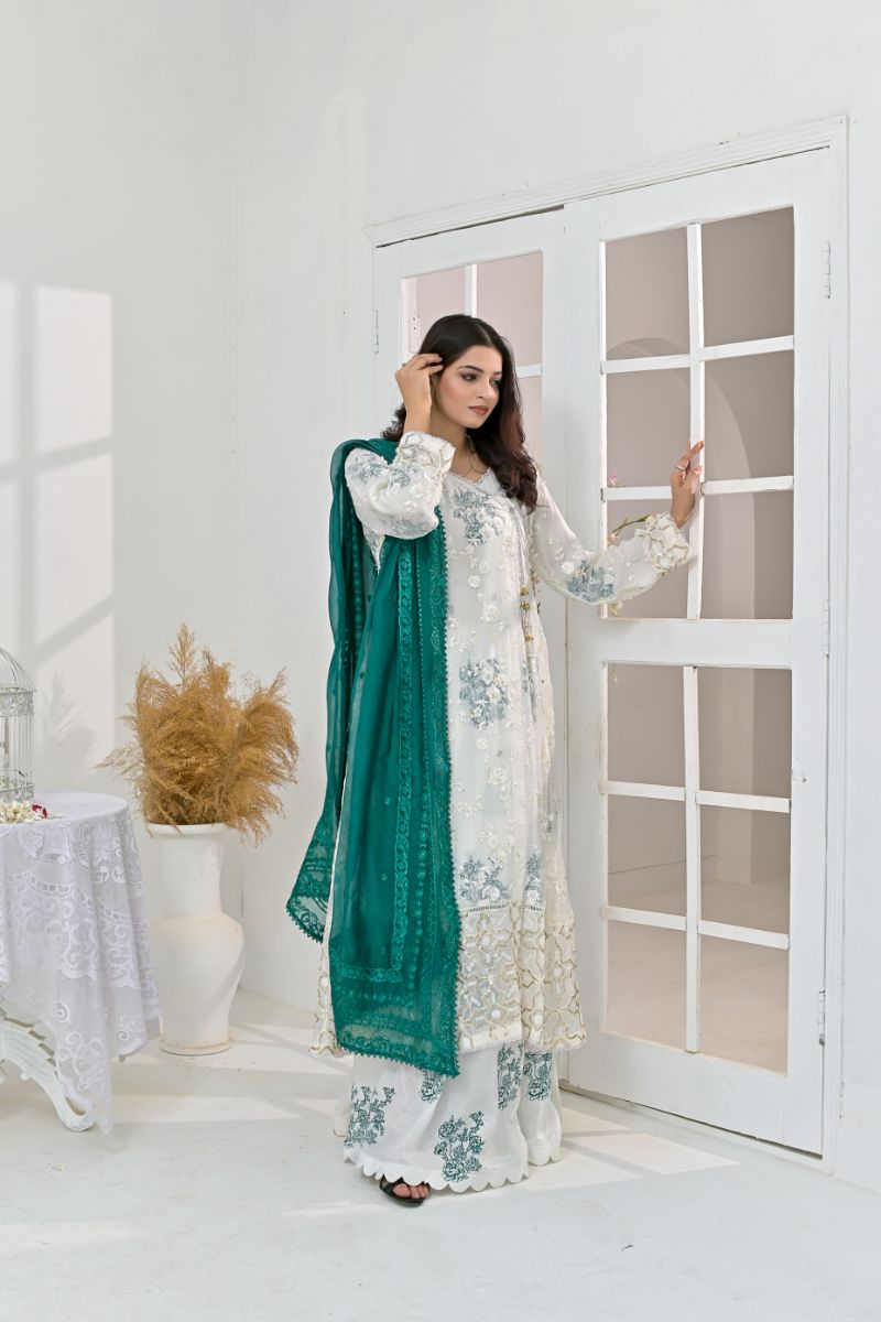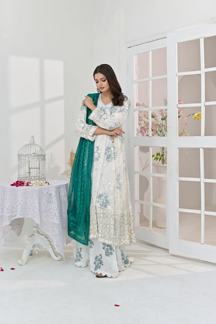The white wrap around chiffon angrakha style shirt with v neckline handcrafted work on the shirt embellishments of Pearls and stones. It has front tassels and a Raw silk Block printed laining. & also printing Gharra nd scallop details. Can be paired with emerled green pure embroidered Organza dupatta.