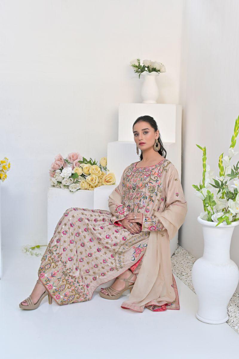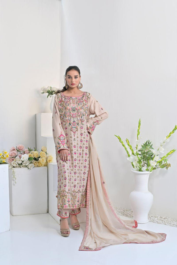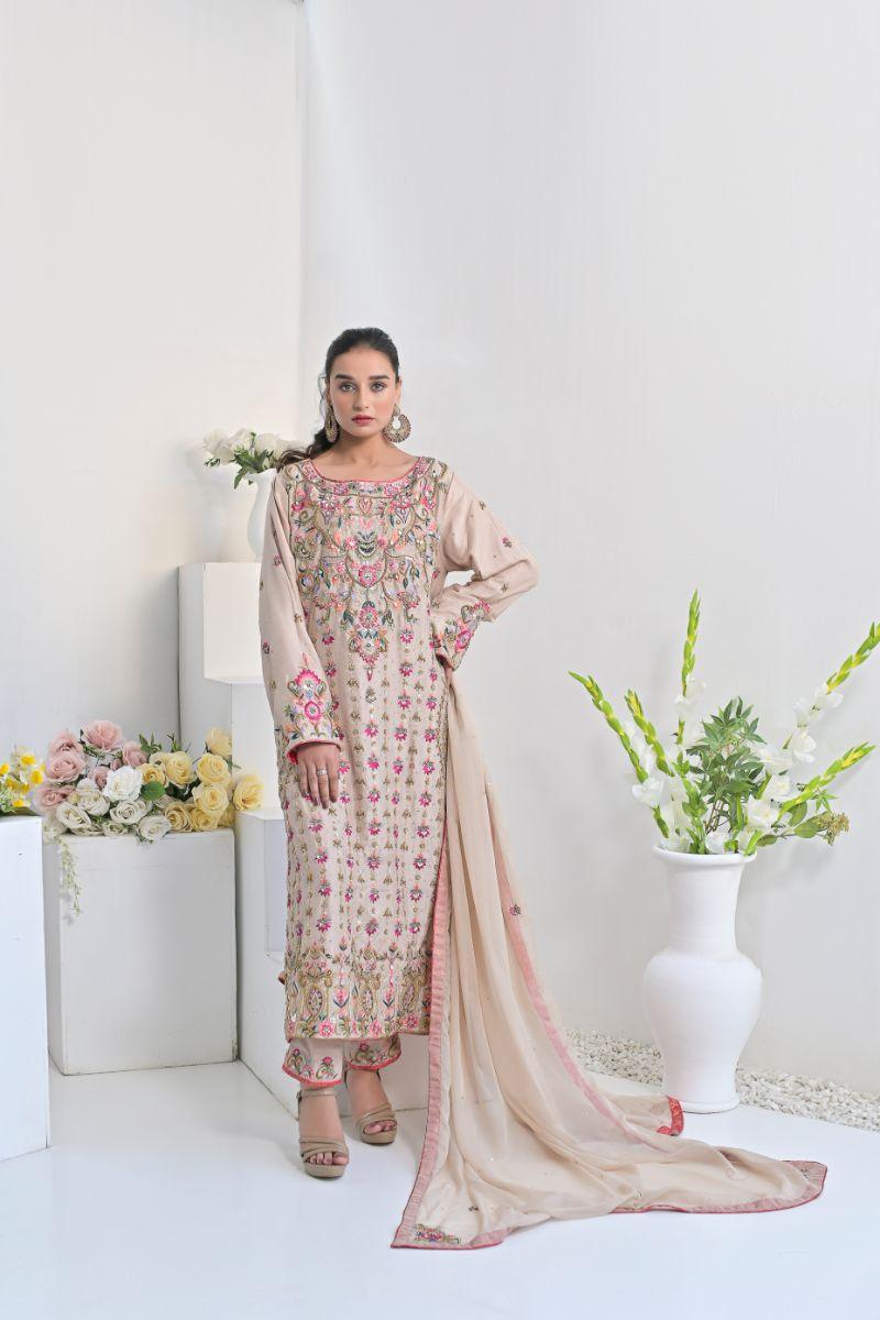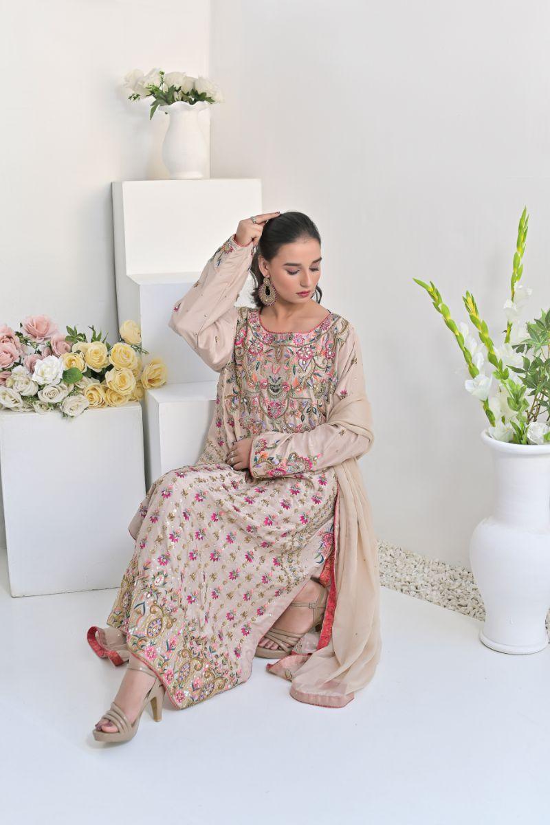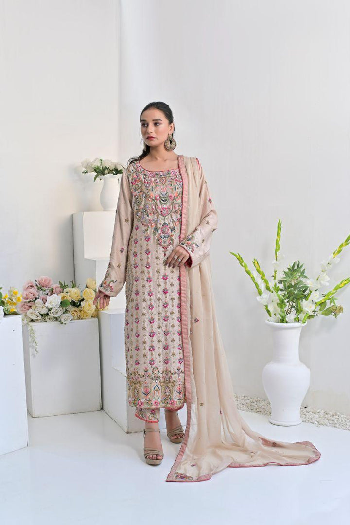 A very beautiful trendy long outfit pure silk Stright shirt in deep multi colour embroidery work . the outfit paired with pure silk straight pant with broder embroidery with seqence work also dupatta with seqence and four side embroidery bunches . Prices are for Shirt & Trouzer with dupatta 3pcs Stiched price. Details:- Shirt Febric:- Pure silk Pant Febric:-Pure silk Dupatta:- Tissue Georgette