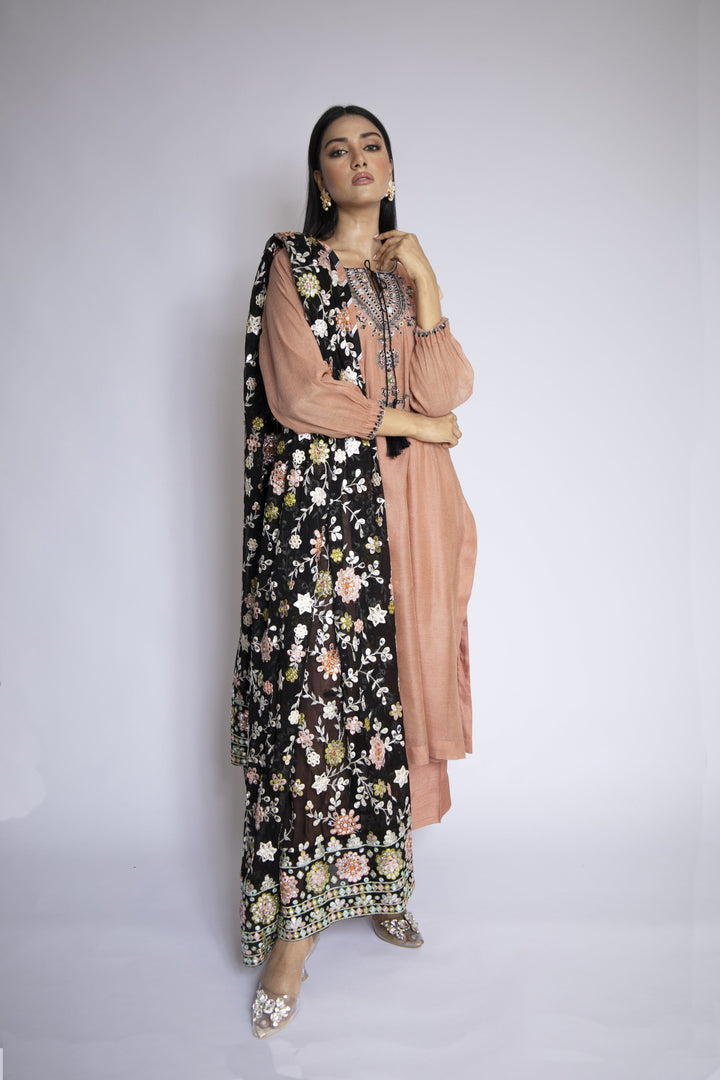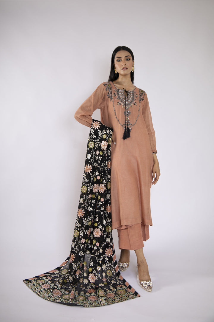 Sadia Aamir - Azara - Tea Pink Khaddi Net Shirt and Silk Culottes with Chiffon Dupatta - 3 Piece