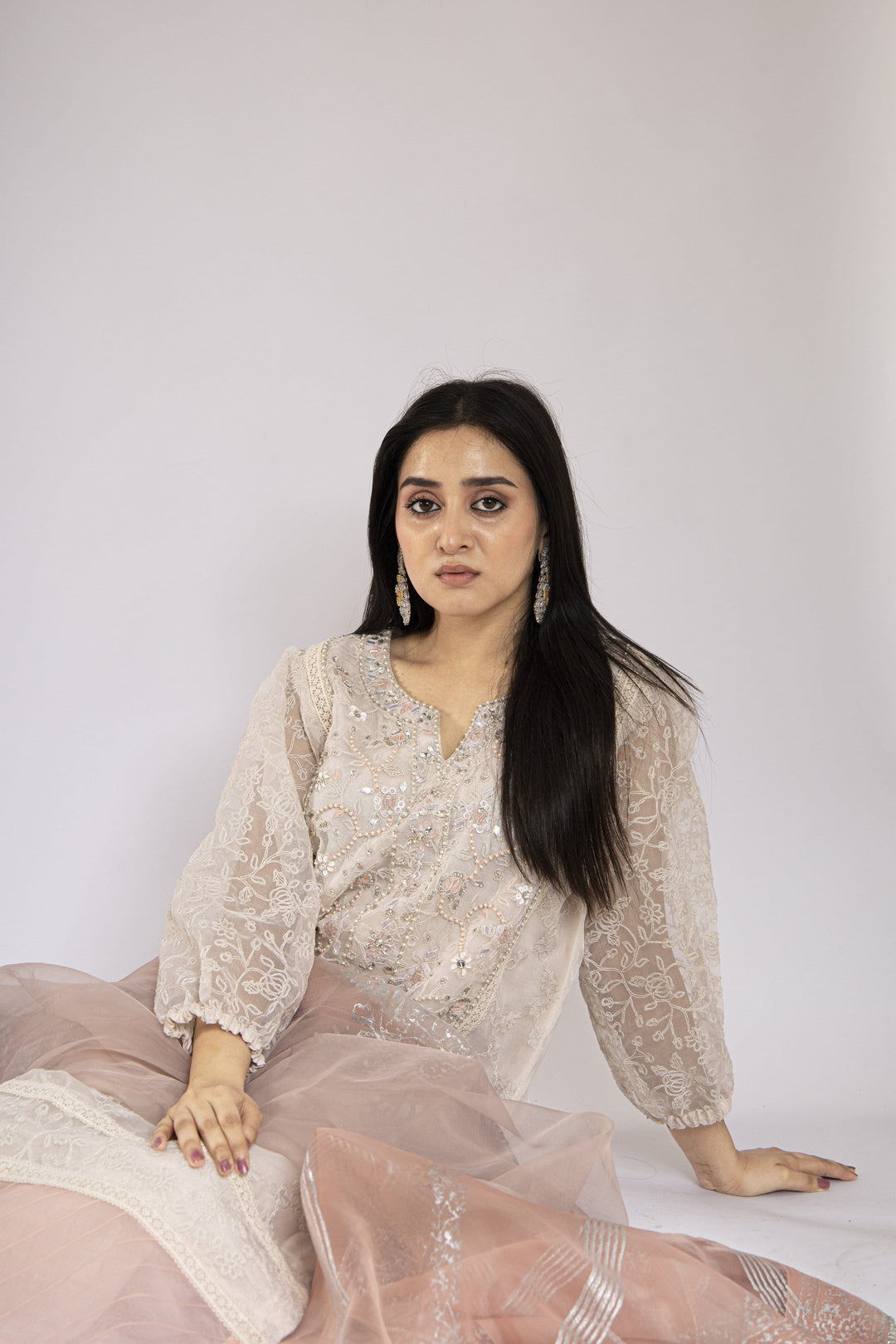 Step into a world of ethereal elegance with Pure Embroidered Organza ensemble, adorned with exquisite zardozi work. Embrace the luxury of Silk Culottes that perfectly complement the enchanting beauty of the outfit. Drape yourself in sheer sophistication with the Organza Dupatta, adorned with mesmerizing block print and delicate lace. Elevate your style to a whole new level of grace and allure!