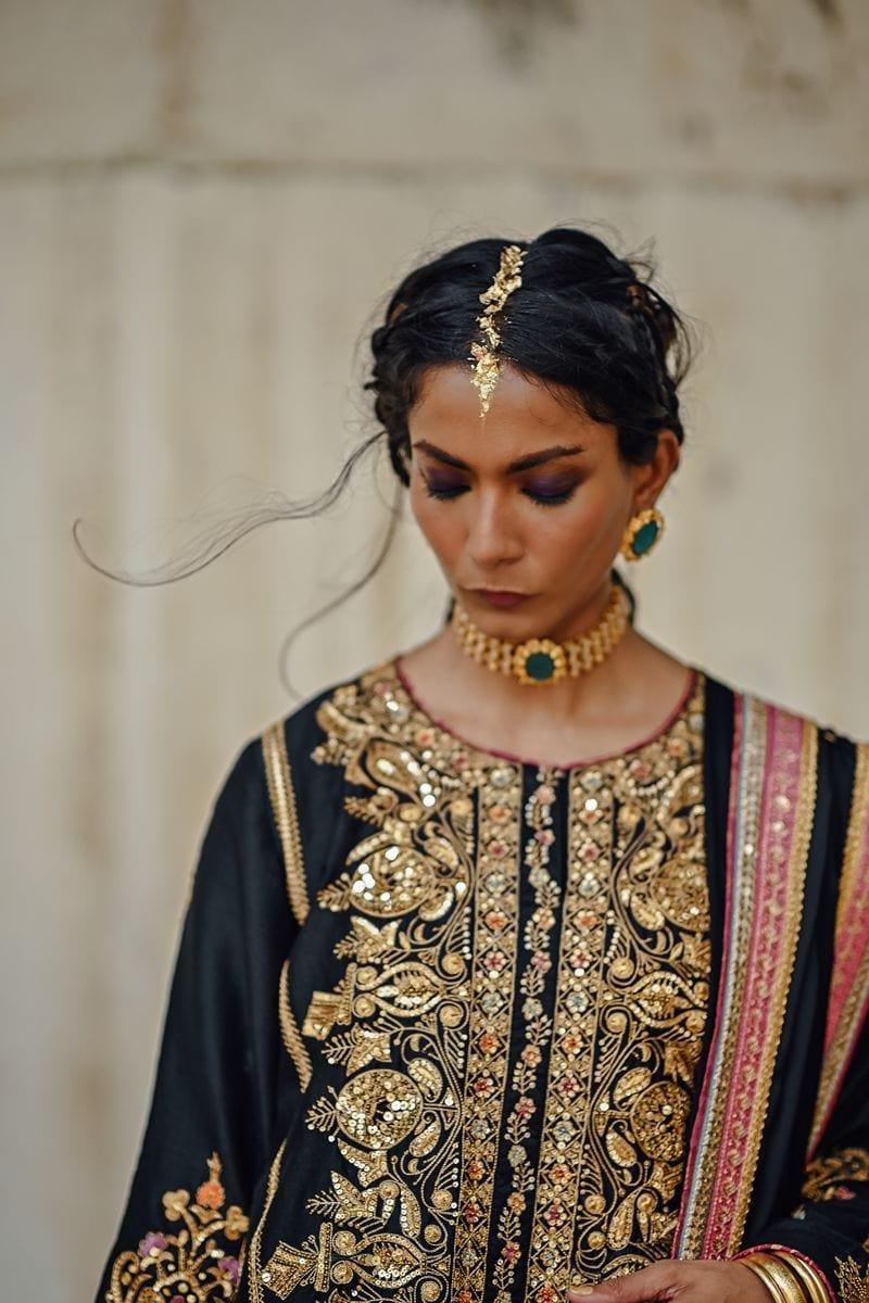 Delicate tilla and sitara handwork on a pure silk kurta, paired with a chatta-patti gharara.