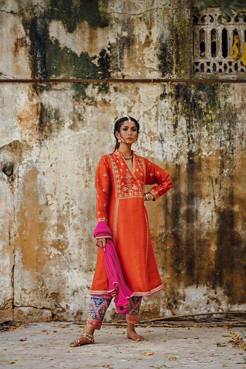 Delicate tilla and sitara handwork on a pure silk kurta, paired with an embellished narrow shalwar.