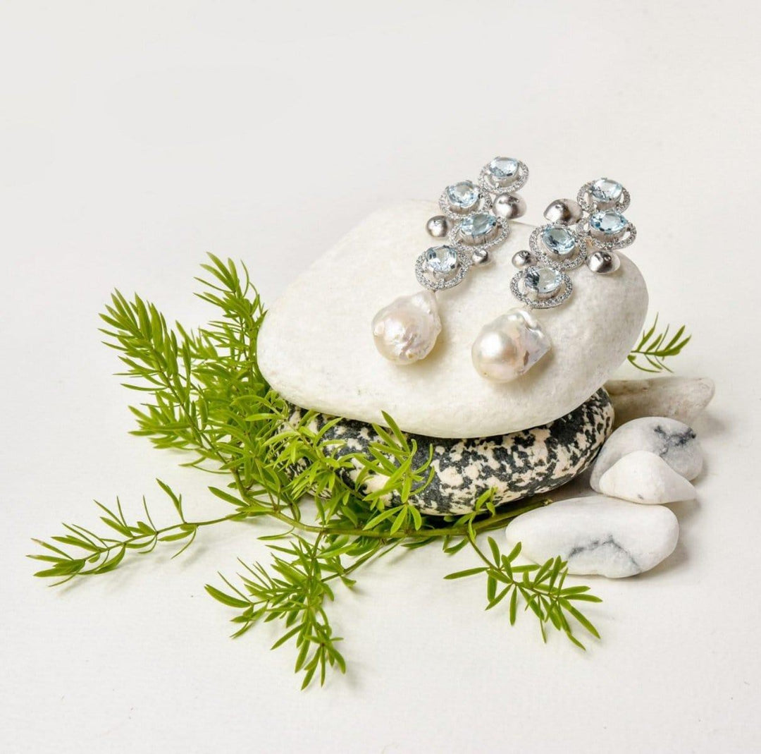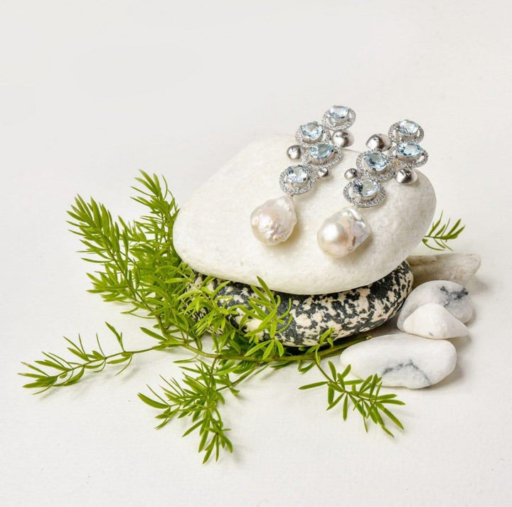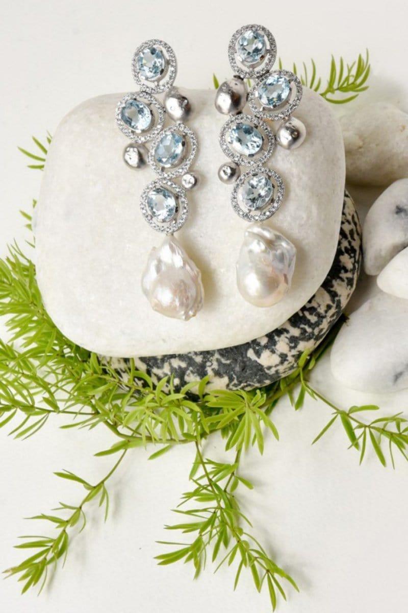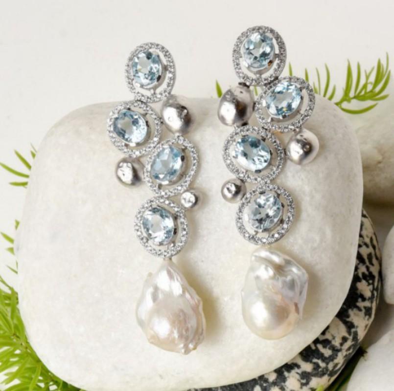 925 Sterling Silver, Rhodium Plating; Real Freshwater Baroque Pearls, Zircons and Real African Blue Topaz. Weight of Blue Topaz approx 28 carats.