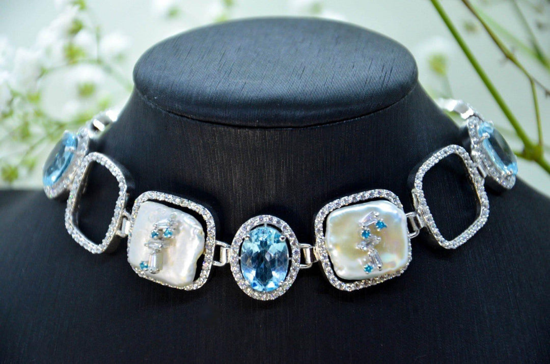 925 Sterling Silver, Rhodium Plating; Real Freshwater Pearls, Zircons and African Natural Blue Topaz. Weight of Blue Topaz approx 30 carats.