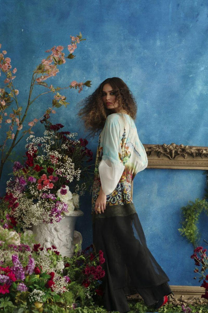 Pure digitally printed crepe silk inspired by landscape scenery/flowers, extended below the hip and after print with pure black organza to floor-length, sleeves extended after an elbow in ivory organza. Three gold medallions motifs worked in gold sequence, beads and pearls placed asymmetrically, gold tilla outlines on printed flowers on the front.