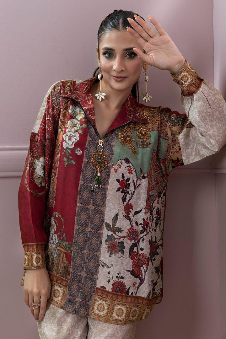 Shamaeel - Silk Embroidered Collared Shirt with Silk Printed Pants