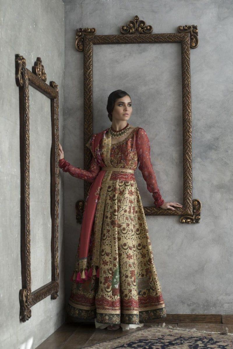 Pure silk printed lehenga inspired by chintz pattern with chiffon sleeves. The upper body worked in gold zardozi.