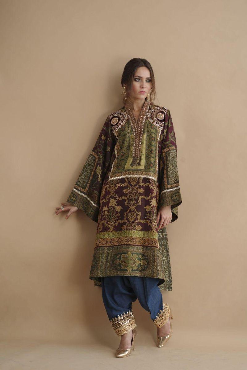 Digitally printed pure raw silk styled as the knee-length tunic. Hand embroidered shoulder motifs worked in gotta and antique tilla with kundan worked galla. Pattis on sleeves and front worked in zardozi. Gold tilla outlines all over front and sleeves borders.
