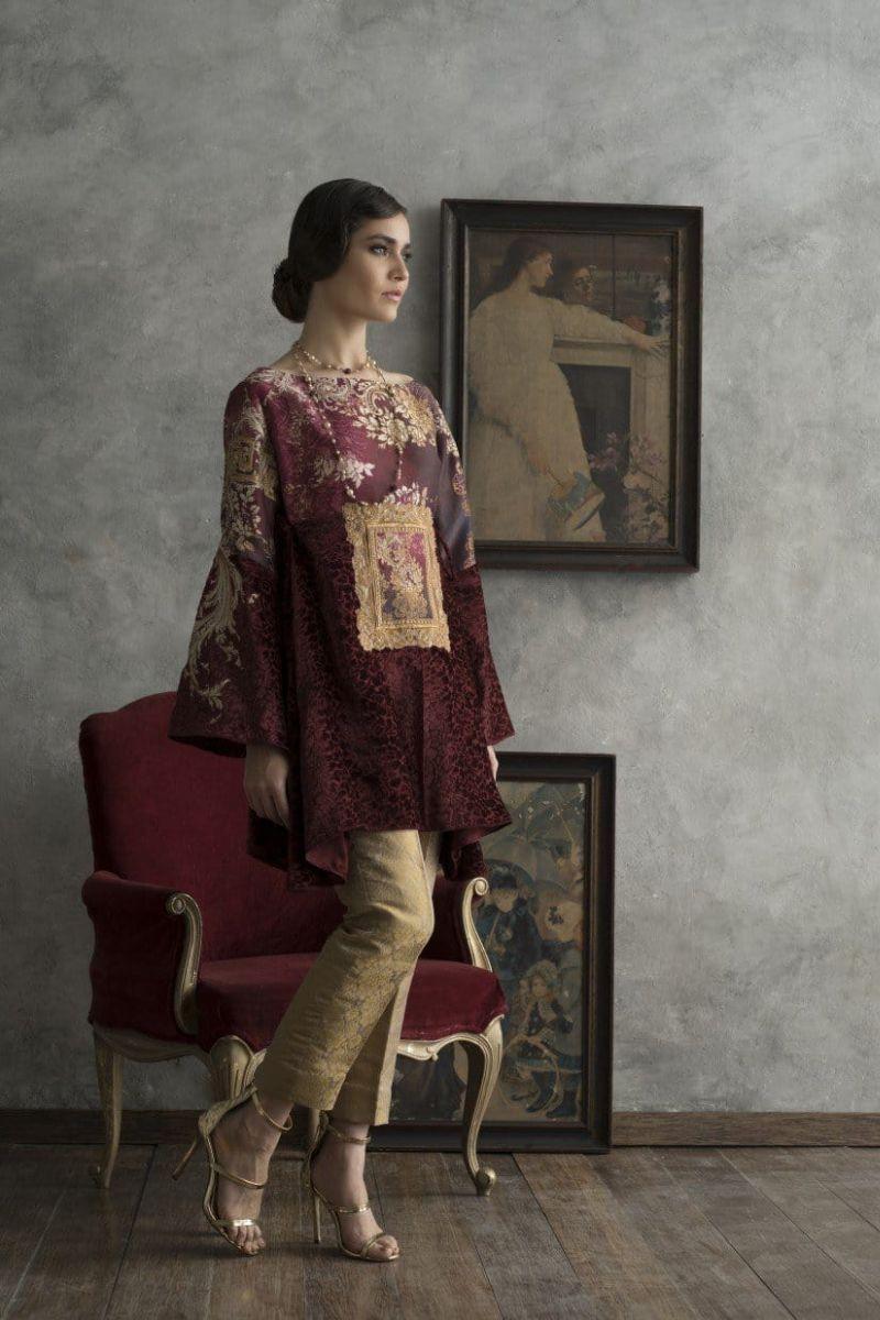 Tunic in pure digital print and palachi fabric. Hand embellishments in gold outline.