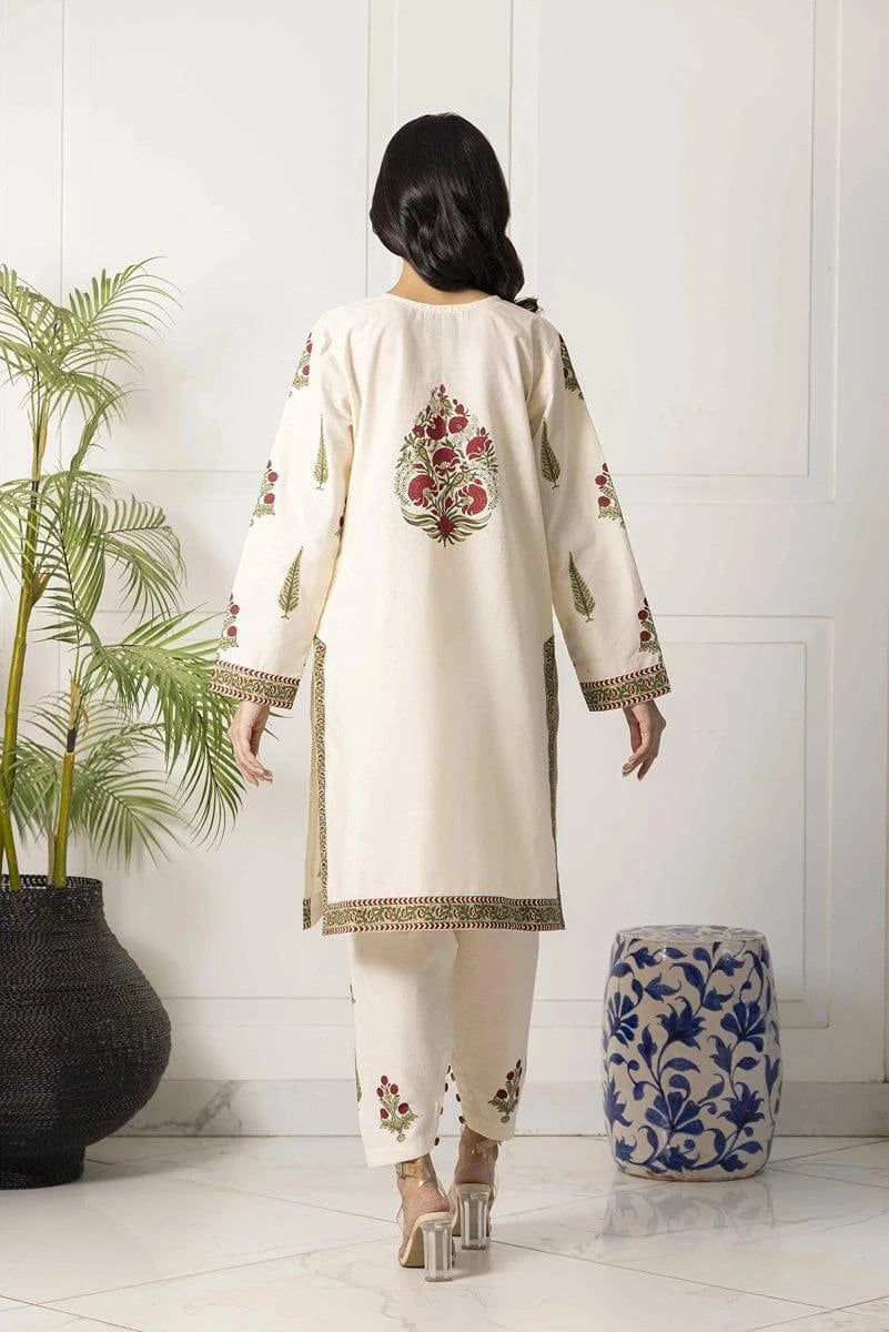 Off-whte block printed cotton shirt with matching shalwar with detailing