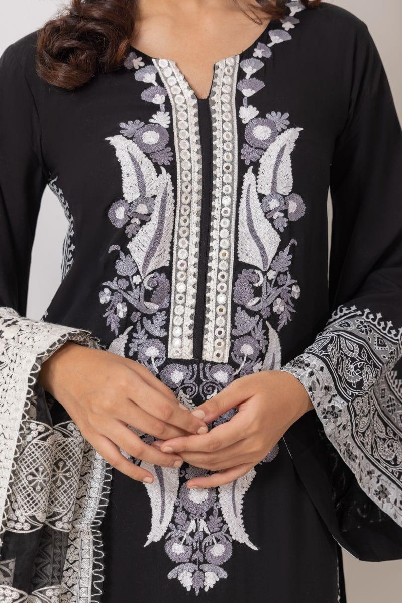 Black & white long shirt with arri work embroidery paired with coordinated azaar.