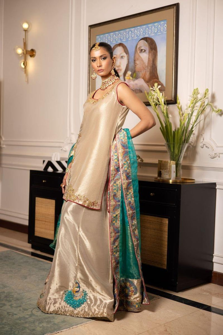 Gold silk shirt with fauna detailing paired with matching izaar pants & blue embellished dupatta.