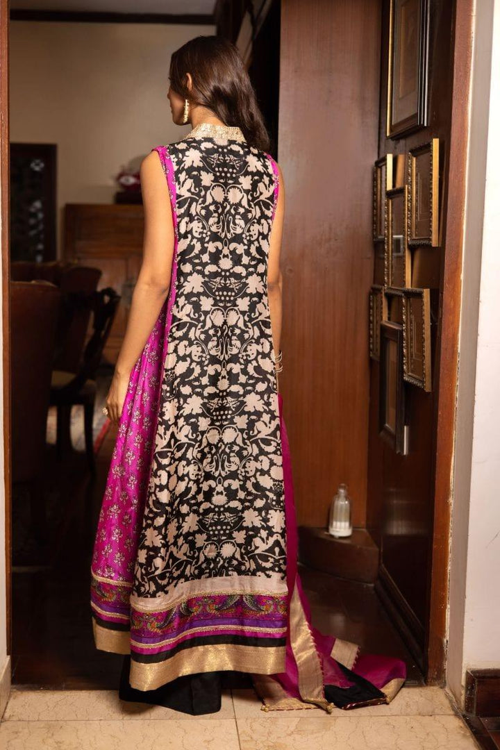 Beige silk & hot pink block printed anarkali with gotaa work paired with matching black capri & hot pink organza dupatta.