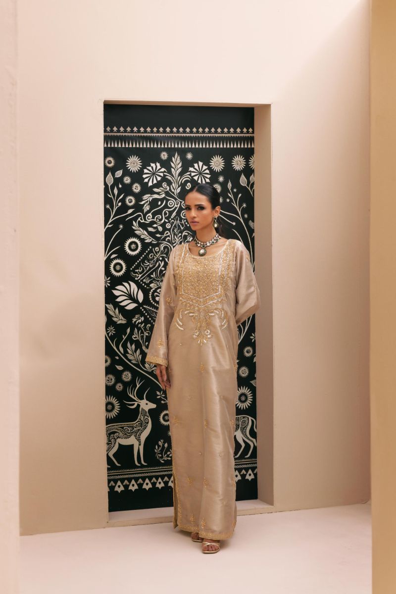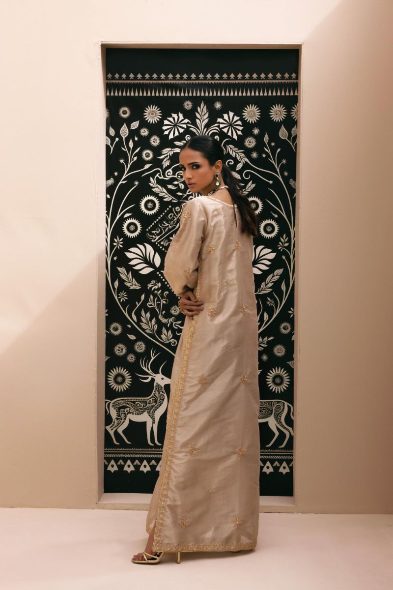 Gold mysore silk kaftan with copper & gold detailing paired with coordinated pants -