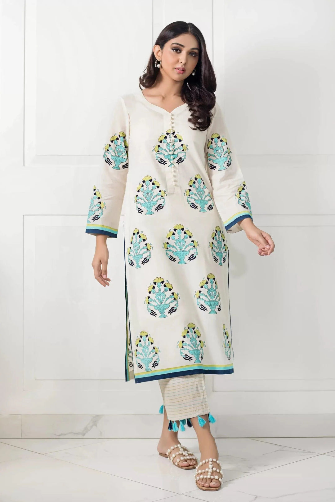 Off-white green and ferozi block printed long shirt & matching azaar with tassel detailing.