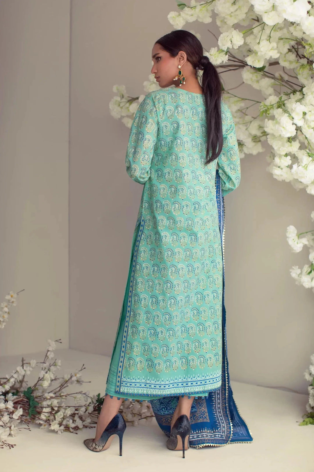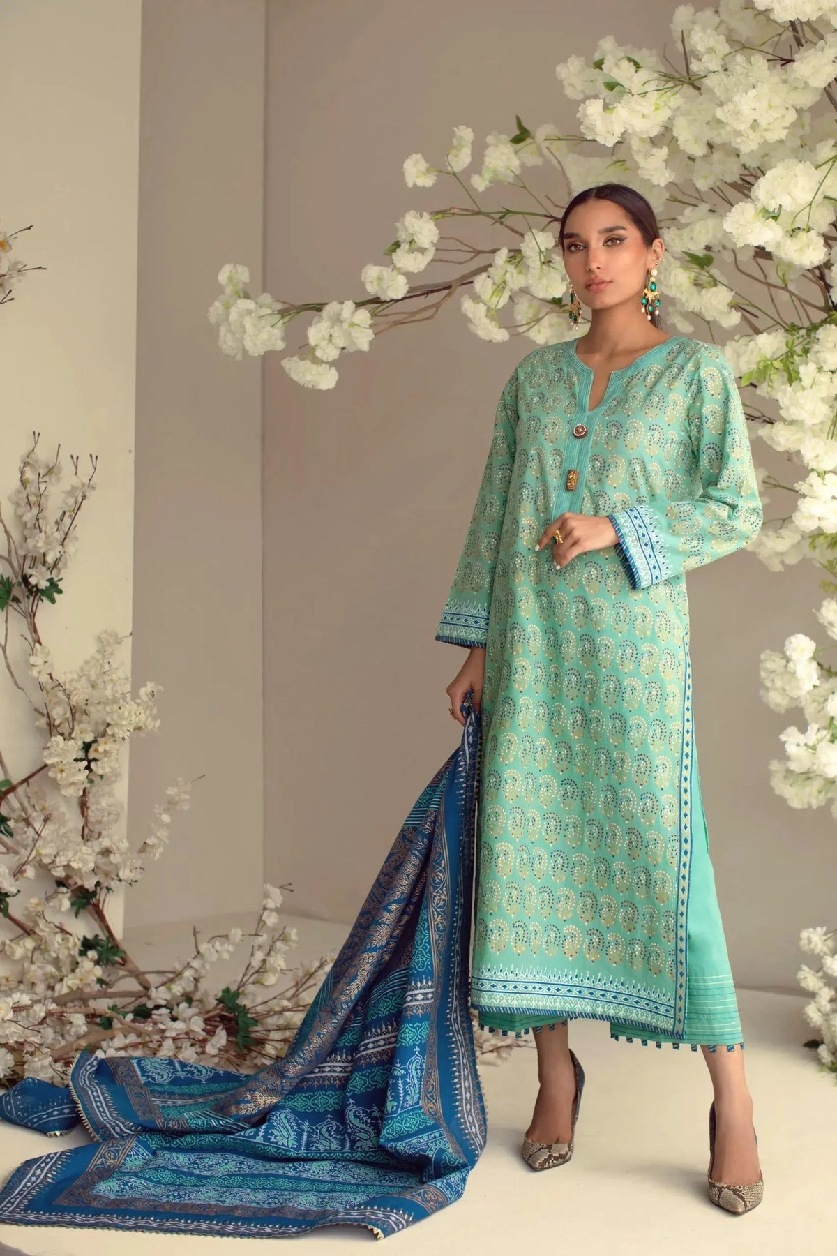 Olive green & blue block printed shirt with matching dupatta & azaar.