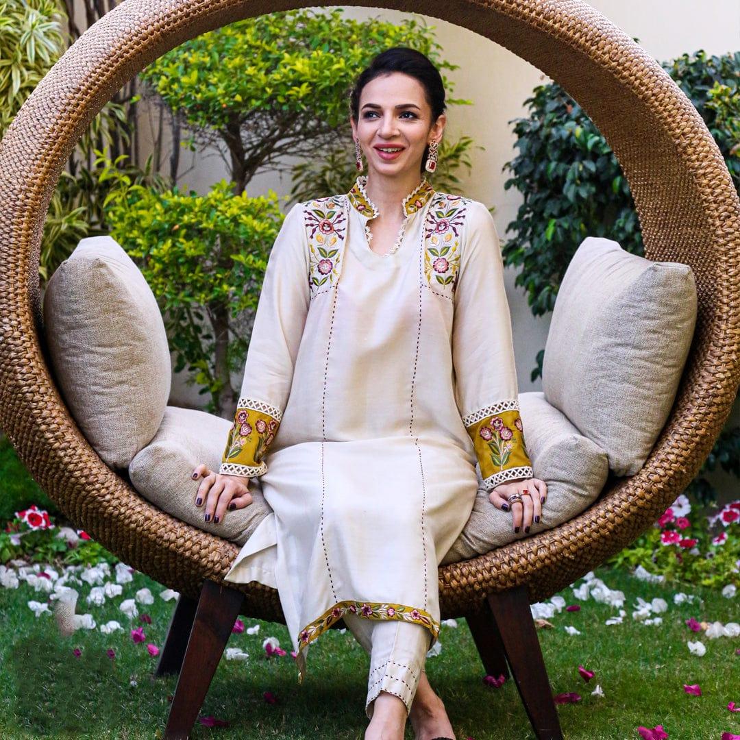 Shirt: Ivory shirt with embroidery details over shoulder, sides, sleeves and daman