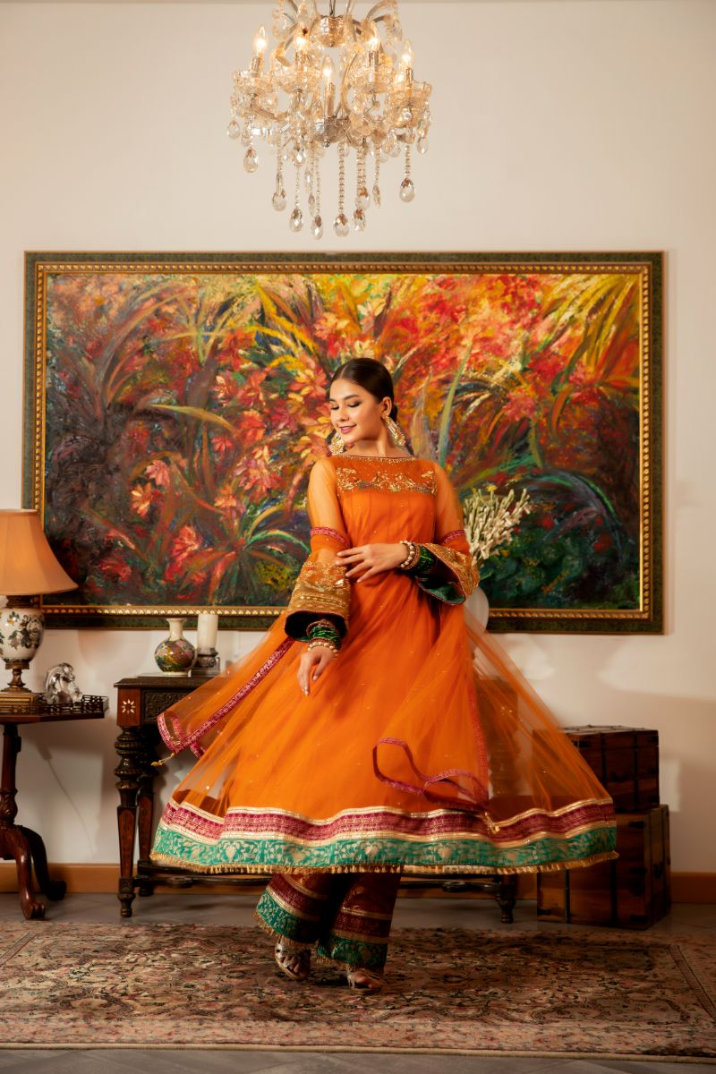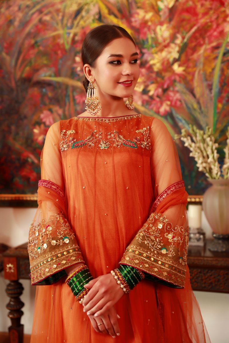 'Genda Phool' is an orange net Ready To Wear Online Formal Women Three Piece Dress kalidar that with handwork on the body and the sleeves along with stunning screen printed borders in magenta and green. It is paired with an izaar, finished with the screen printed borders along with a net dupatta with banarsi finishings.