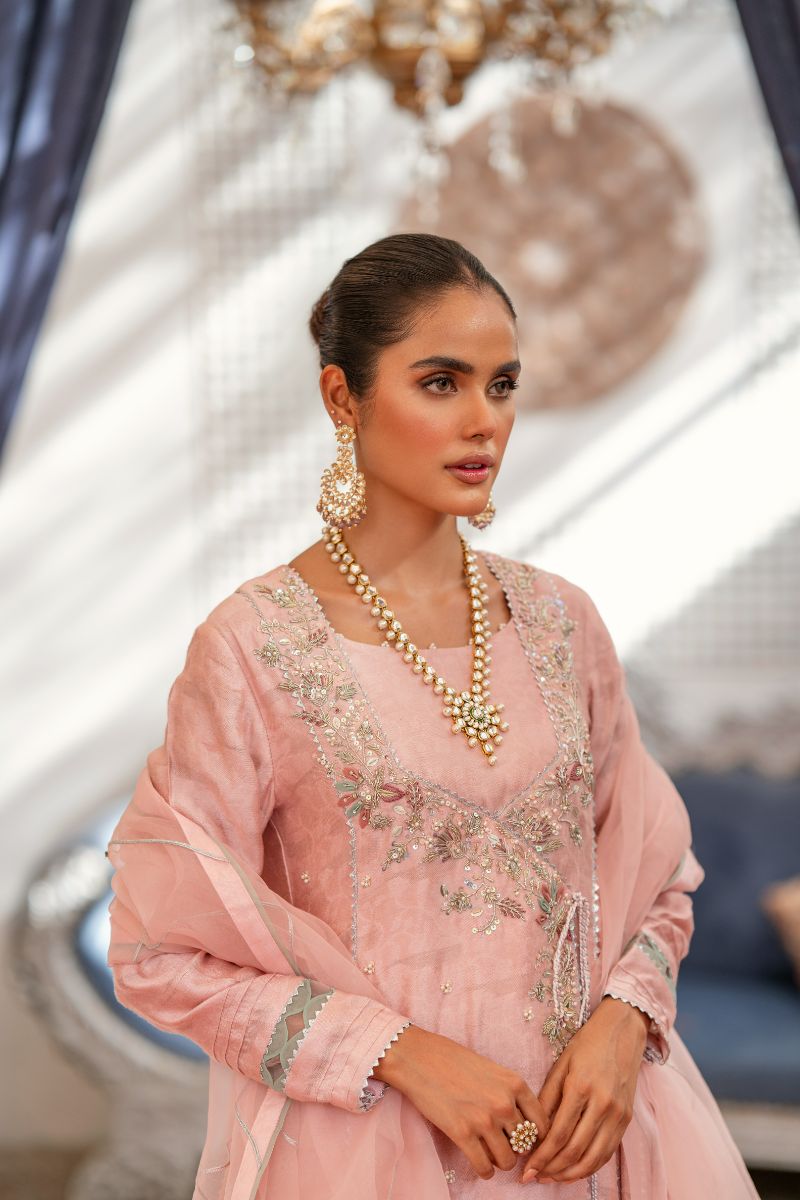 'Guzel' is a blush pink jacquard angrakha which has an intricate hand worked neckline with 3D organza petals and fancy hand made pearl tassels. The front has sequins and pearl chann. It has an organza embroidered border all over. Sleeves has organza scallops and lace details. It is paired with pk raw silk pink straight pants and an organza dupatta with fancy border and details.