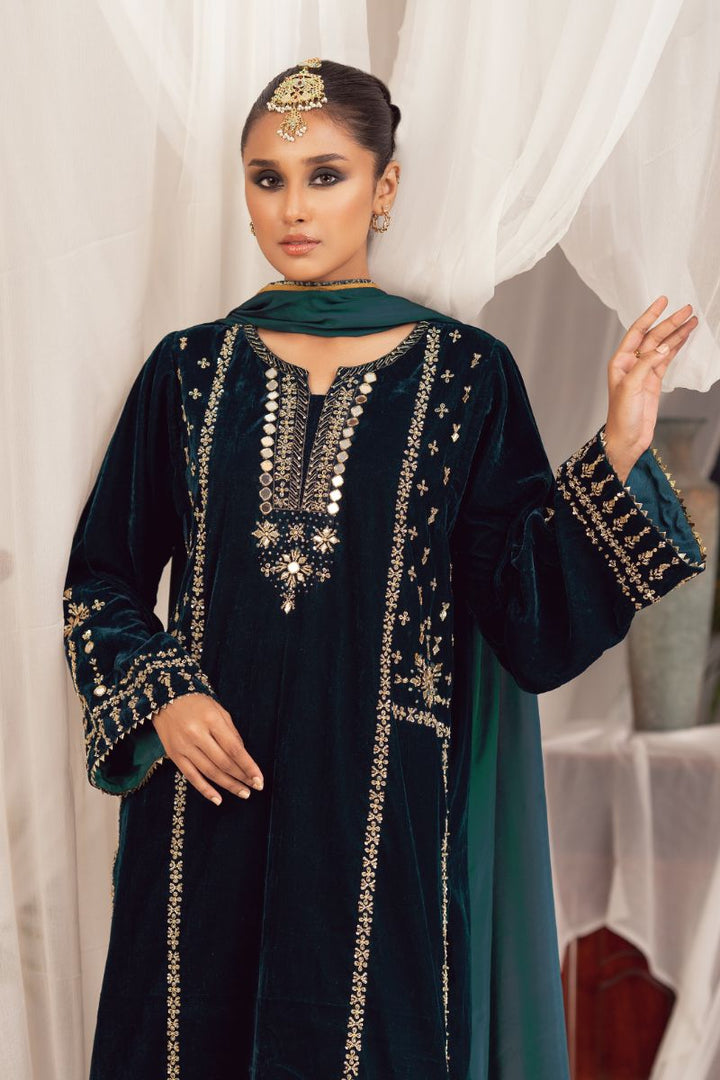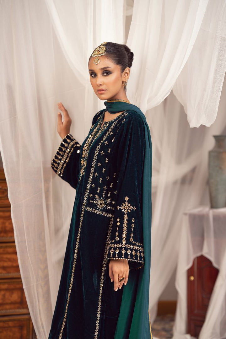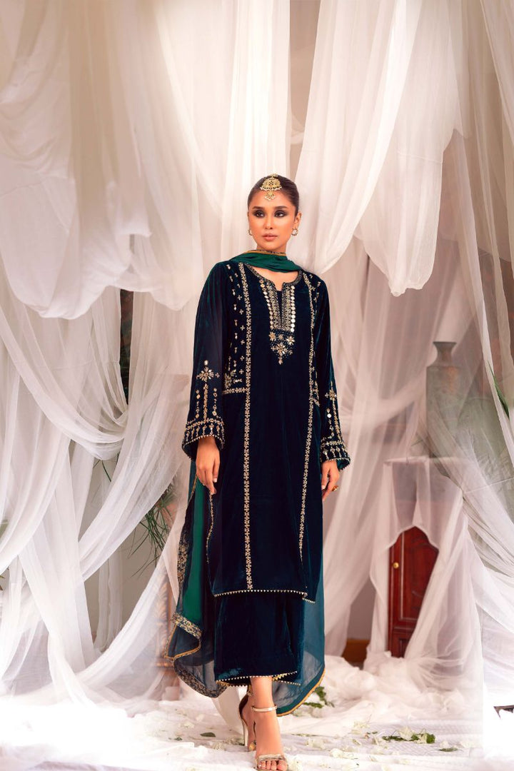 "Maha" is a boxy velvet silhouette with an ethereal sheesha and zardozi embroidery front. For a classic look, it is paired with velvet culottes finished with triangle-laced hem. Complimented with dhani-ochre organza or tissue silk dupatta with banarsi finishing over all.
