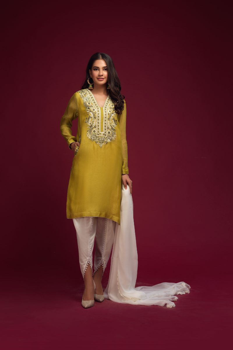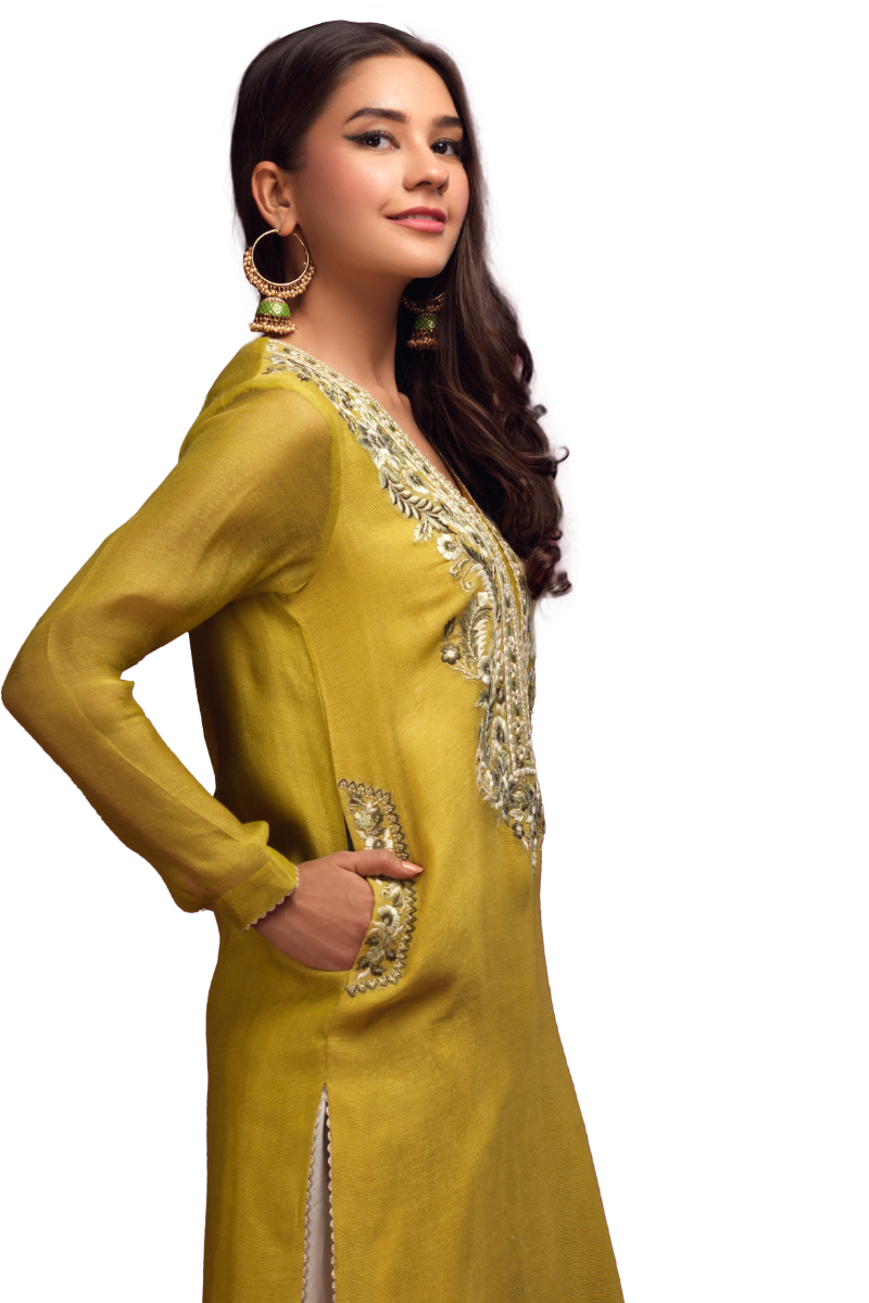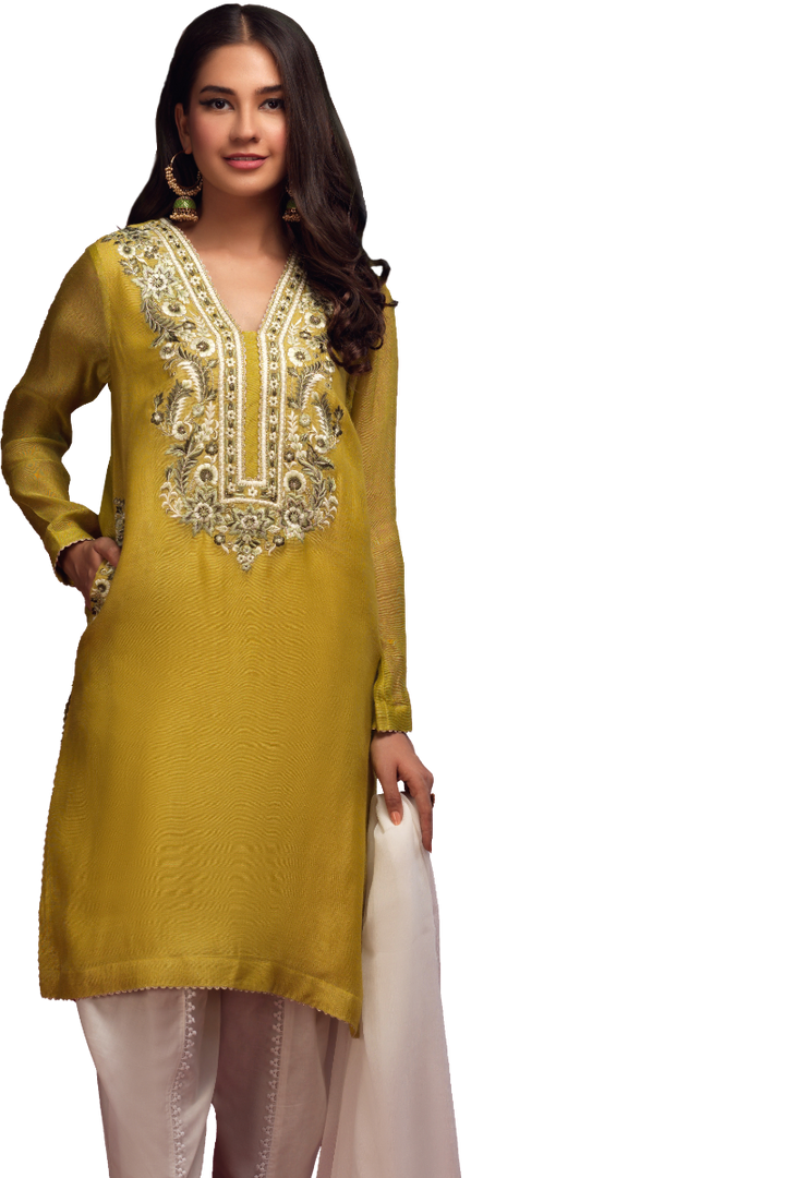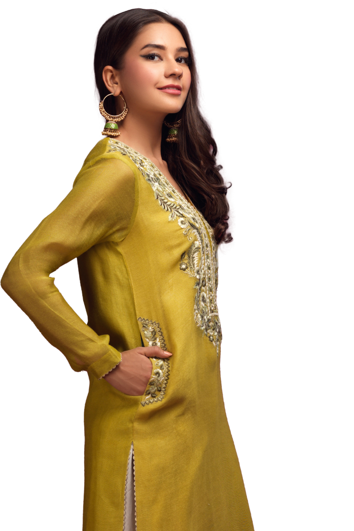 Make a style statement this season in an 'Olive Bloom' elegantly embroidered green khaadi net kurta. Adorned with detailed thread embroidery on the neckline and pockets channeling cool vibes in this warm temperature.