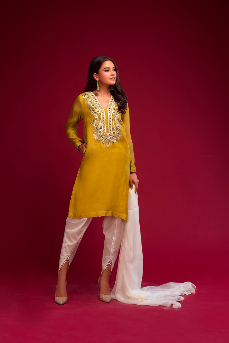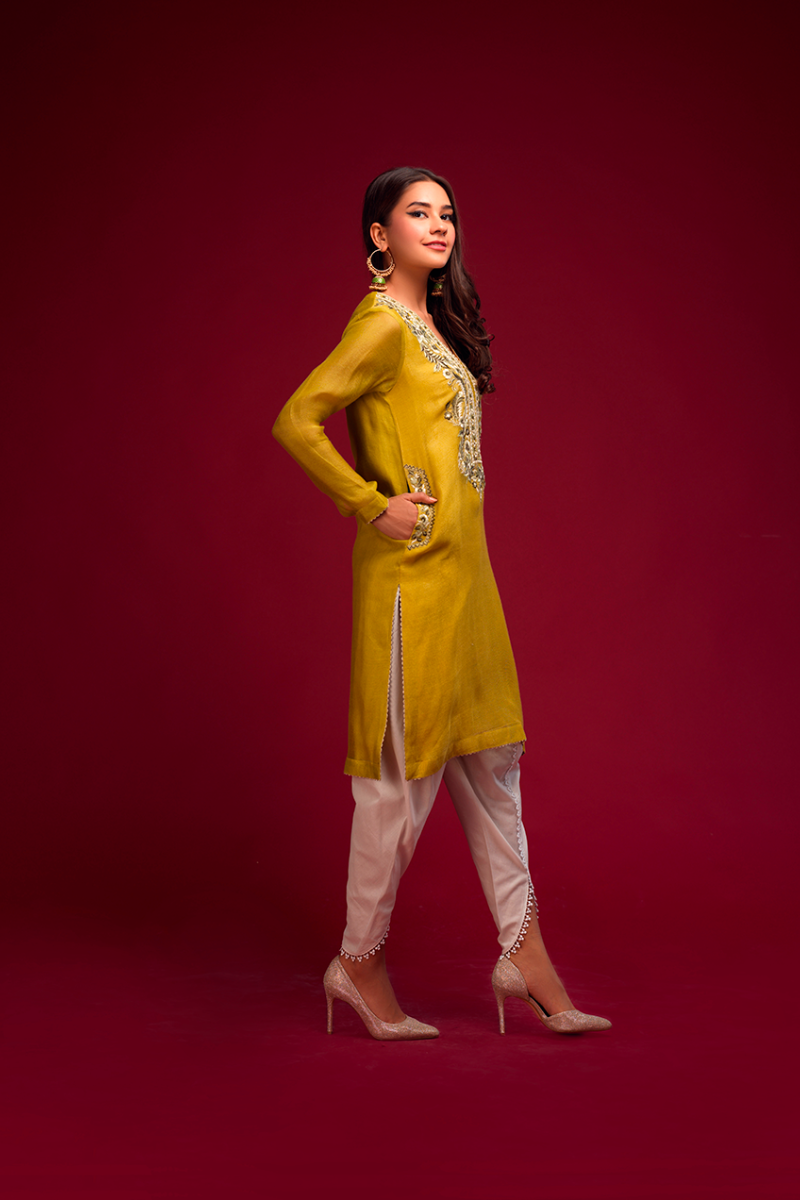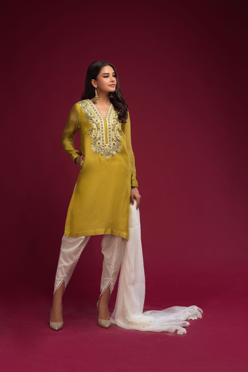 Make a style statement this season in an 'Olive Bloom' elegantly embroidered green khaadi net kurta. Adorned with detailed thread embroidery on the neckline and pockets channeling cool vibes in this warm temperature.