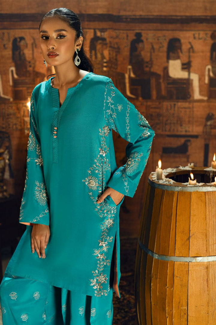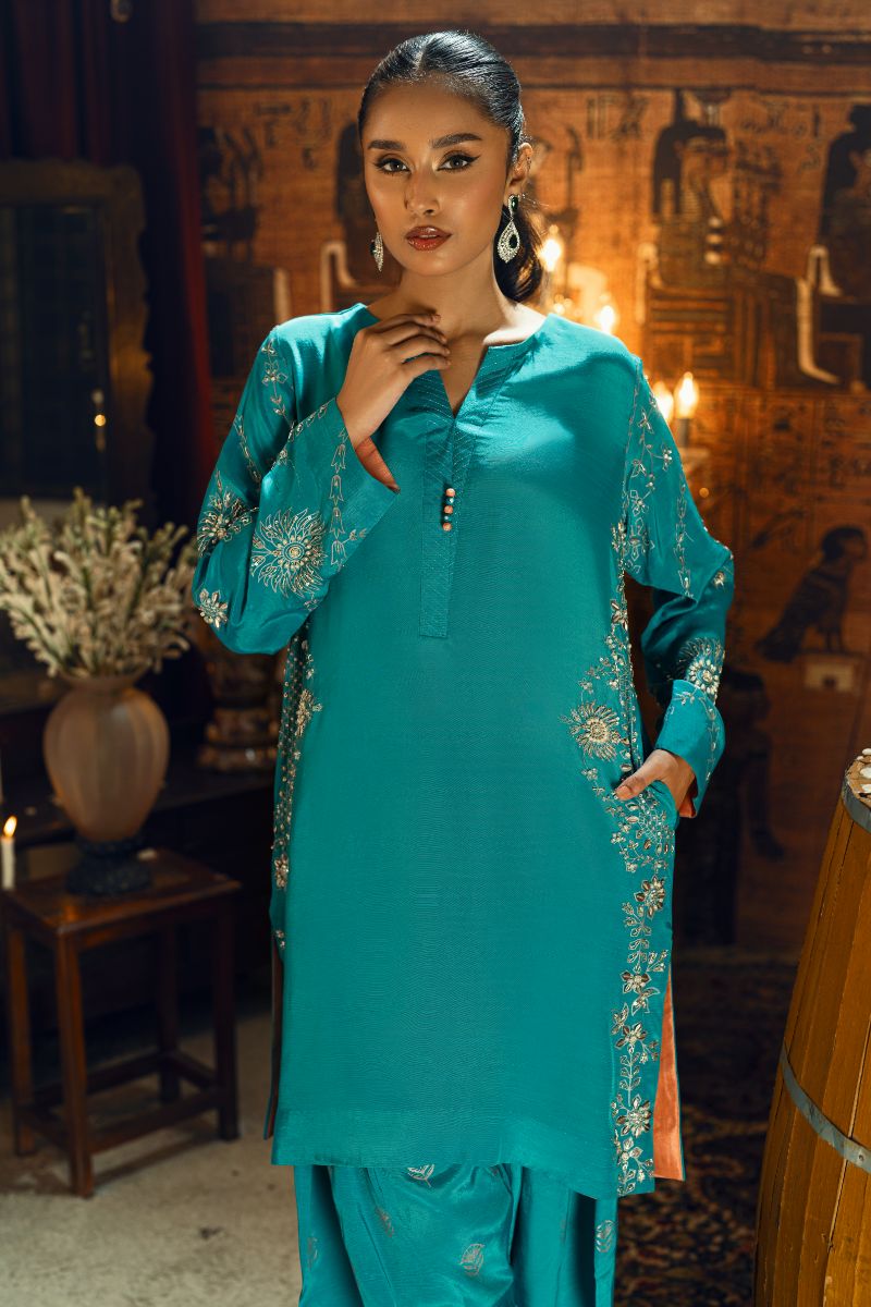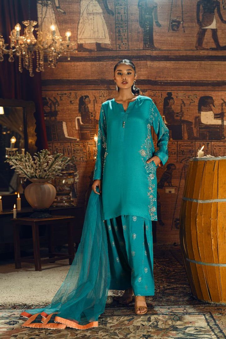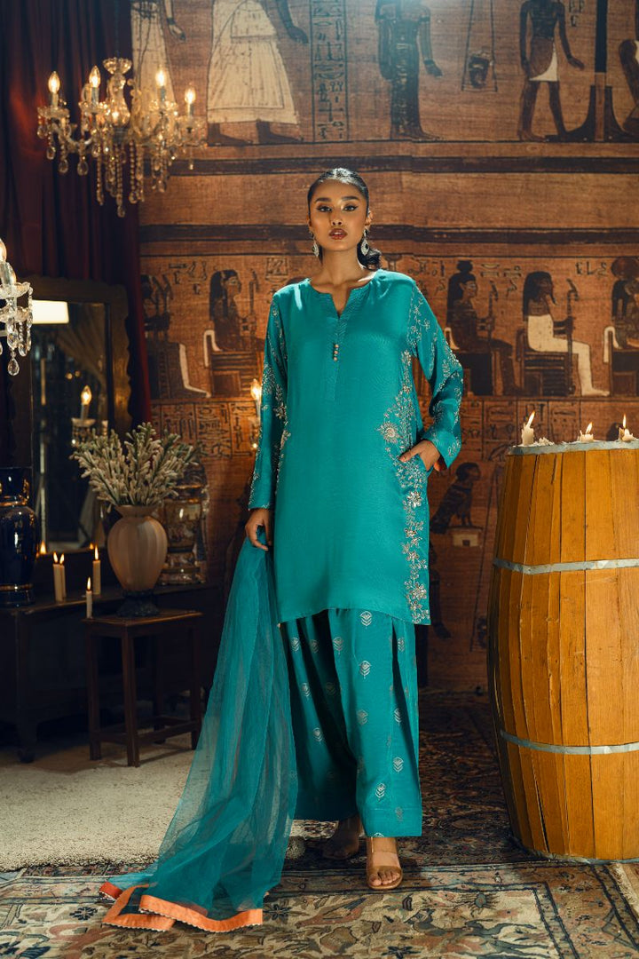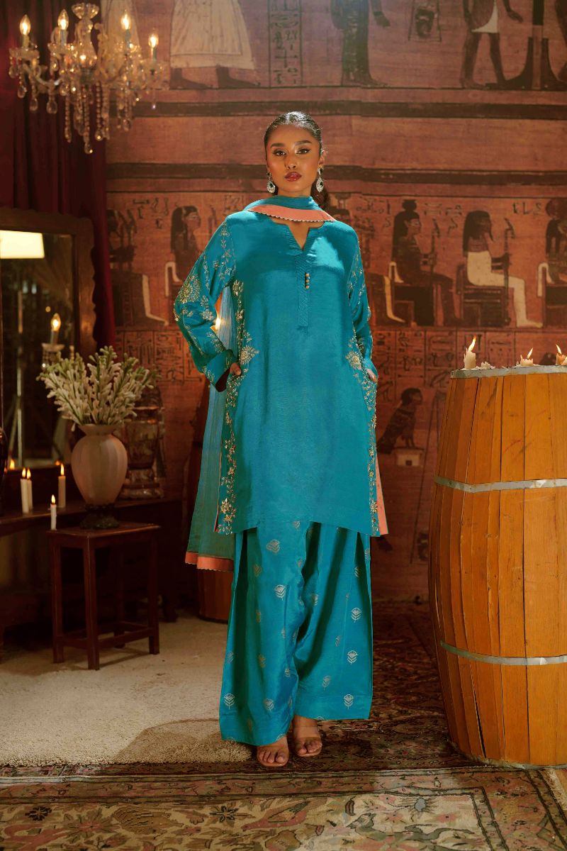 "Resut" is an aqua blue straight short shirt featuring side pockets and alluring screen print in the front sides or sleeves embellished with pearls, dabka, sequins and zardozi work. It is paired with matching screen printed shalwar and matching net dupatta finished with coral and rust color details on border over all.
