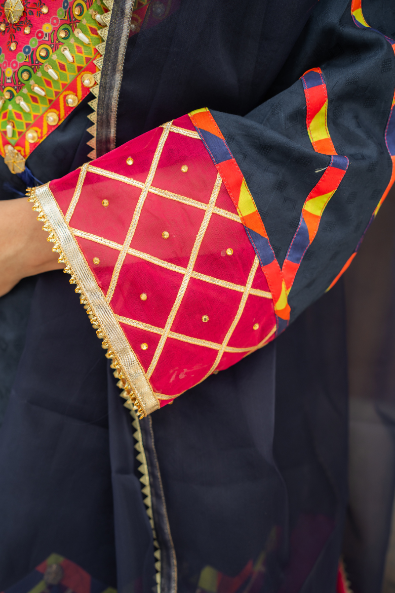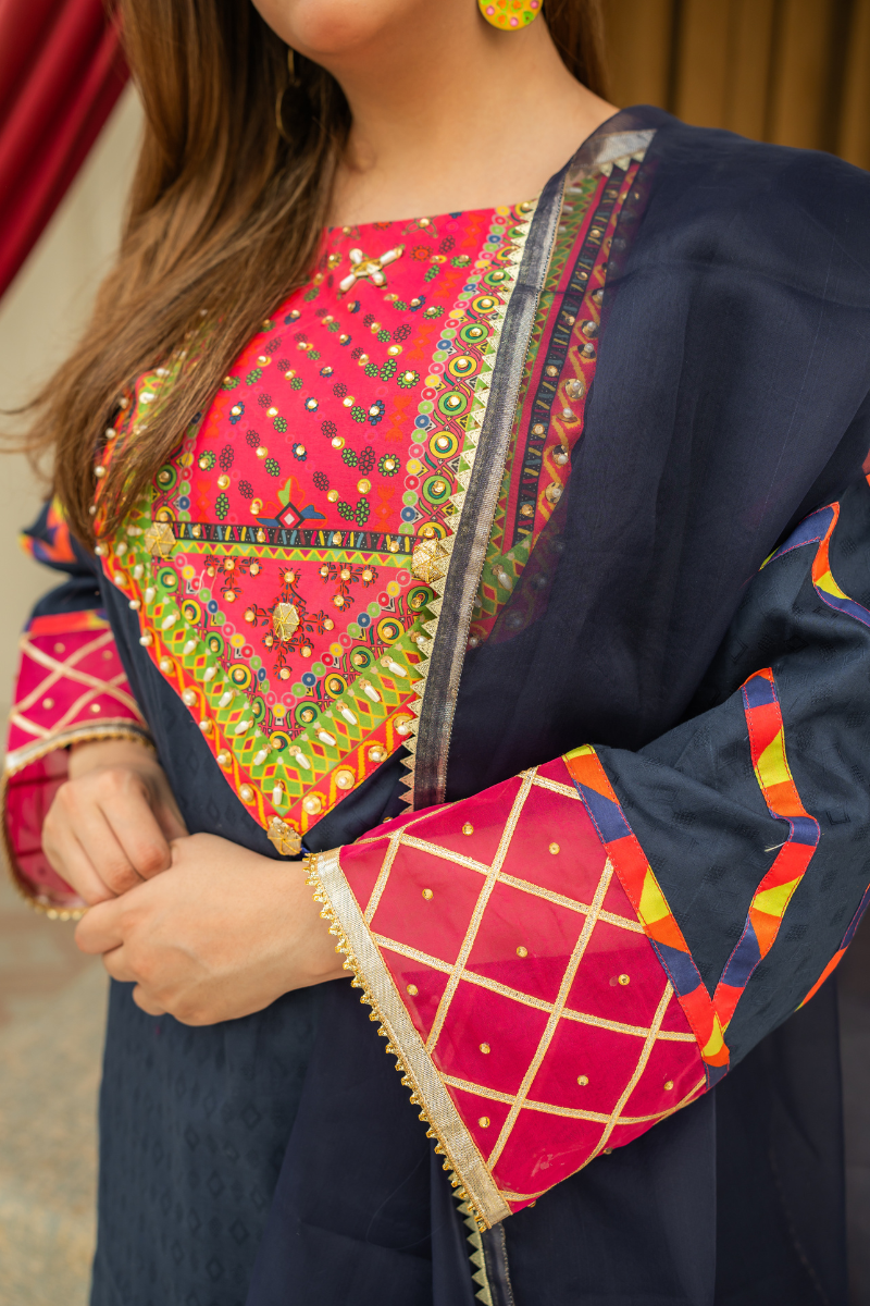 Blue lawn shirt with Farshi shalwar Adorned with digital print multi colour neckline, check border with charma and swarski. Lawn farshi shalwar with gotta edging. Organza duppata in blue and pink colour.