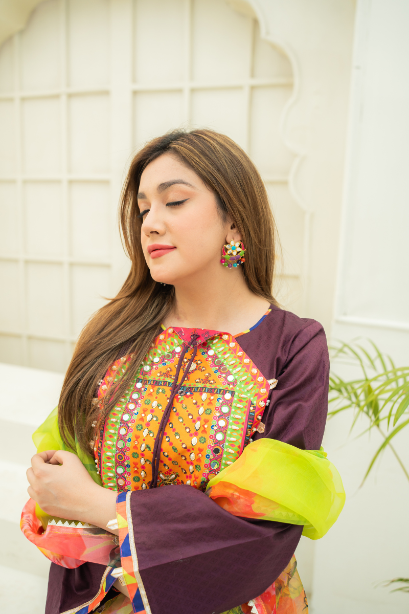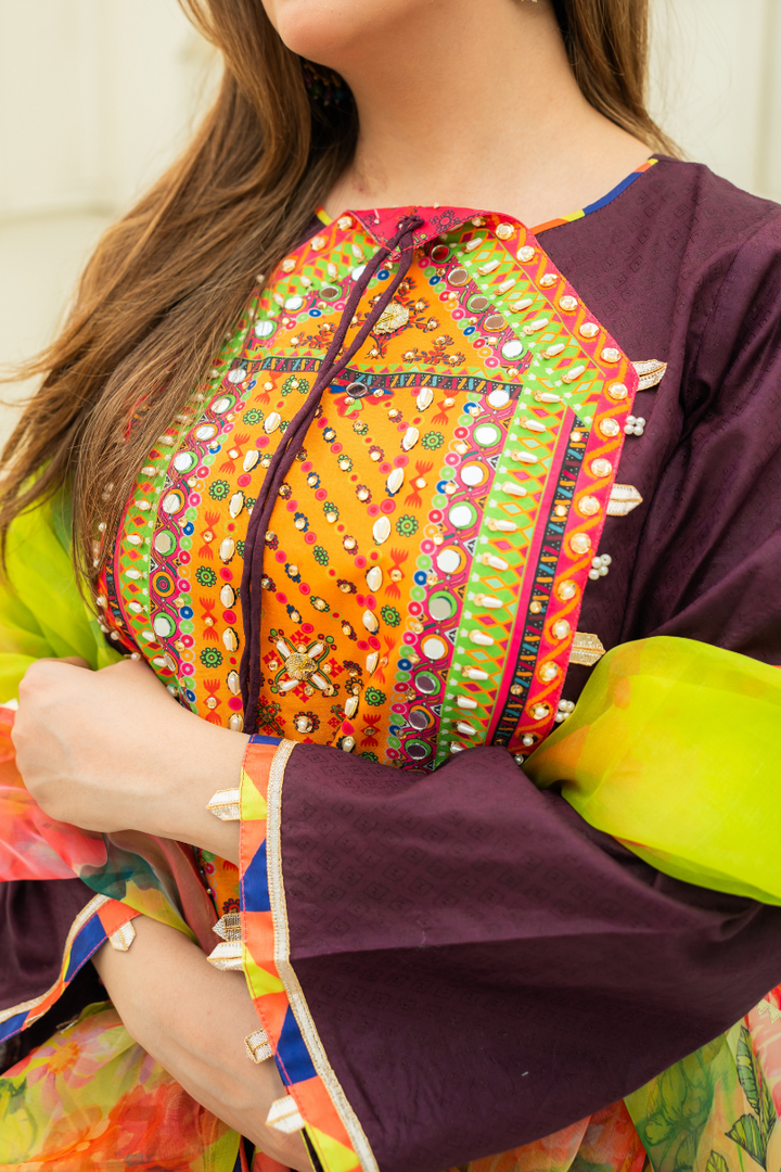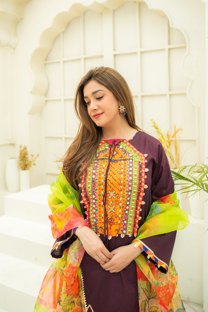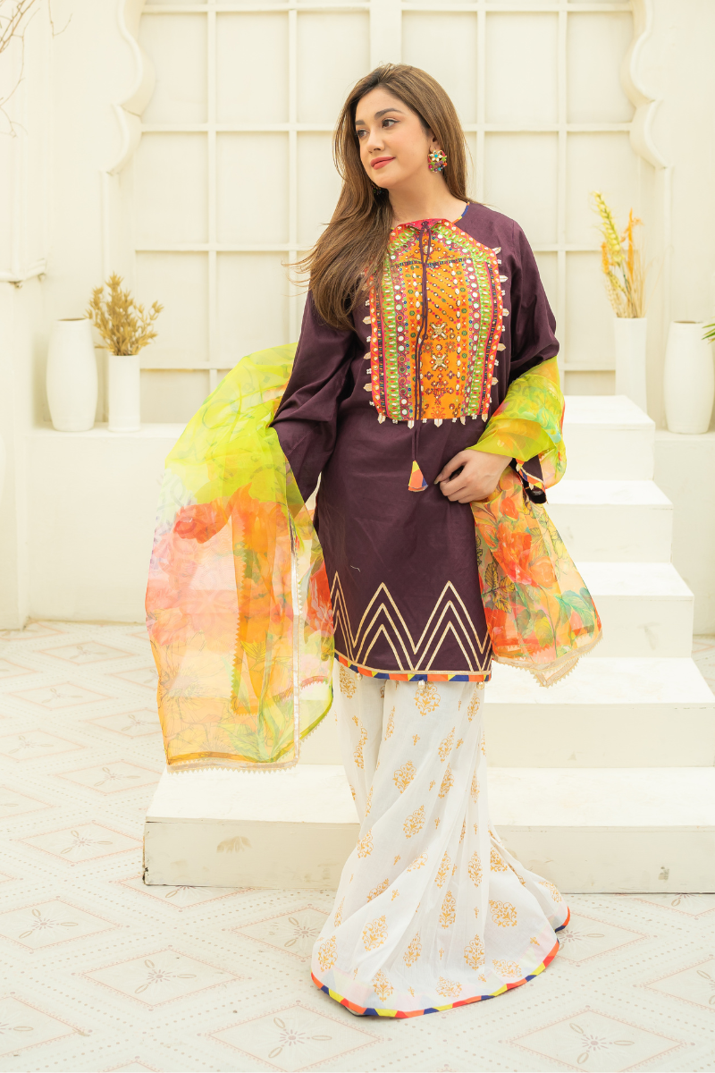 Plum lawn shirt adorned with digital printed neckline with pearl, mirror and beaded embellishment. Charma triangle detailing on bottom. paired with white lawn gharara and digital printed multi-color organza dupatta.